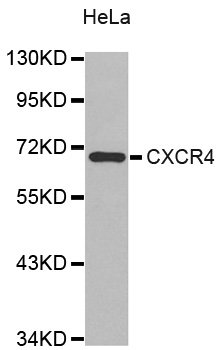 Western blot analysis of extracts of HeLa cells, using CXCR4 antibody. Secondary antibody: HRP Goat Anti-Rabbit IgG (H+L) at 1:10000 dilution. Lysates/proteins: 25ug per lane. Blocking buffer: 3% nonfat dry milk in TBST.