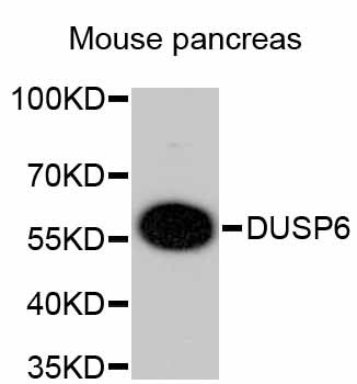 Western blot analysis of extracts of mouse pancreas, using DUSP6 antibody. Secondary antibody: HRP Goat Anti-Rabbit IgG (H+L) at 1:10000 dilution. Lysates/proteins: 25ug per lane. Blocking buffer: 3% nonfat dry milk in TBST.