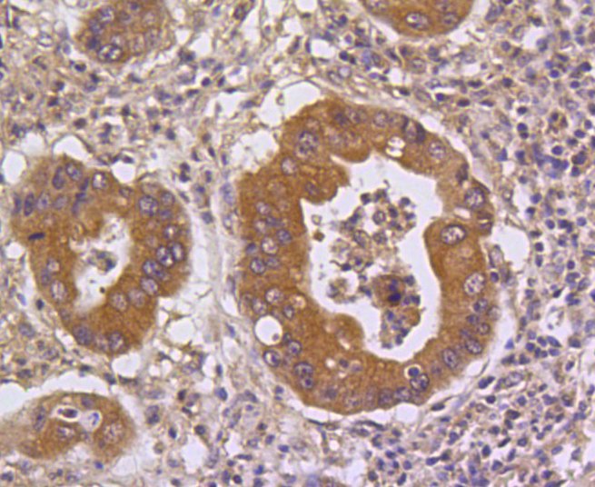 Immunohistochemistry of paraffin-embedded human gastric cancer using DUSP6 antibody at dilution of 1:100 (40x lens).