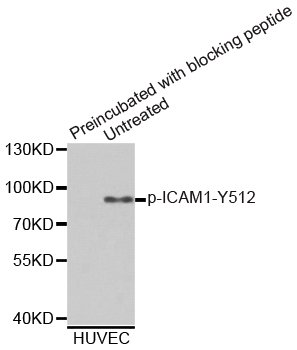 Western blot analysis of extracts of HUVEC cells, using Phospho-ICAM1-Y512 antibody. Secondary antibody: HRP Goat Anti-Rabbit IgG (H+L) at 1:10000 dilution. Lysates/proteins: 25ug per lane. Blocking buffer: 3% BSA.