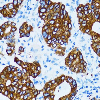 Immunohistochemistry of paraffin-embedded human lung cancer using CTSE antibody at dilution of 1:100 (40x lens).