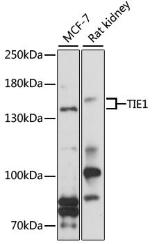 Western blot analysis of extracts of various cell lines, using TIE1 antibody at 1:1000 dilution. Secondary antibody: HRP Goat Anti-Rabbit IgG (H+L) at 1:10000 dilution. Lysates/proteins: 25ug per lane. Blocking buffer: 3% nonfat dry milk in TBST. Detection: ECL Basic Kit. Exposure time: 30s.