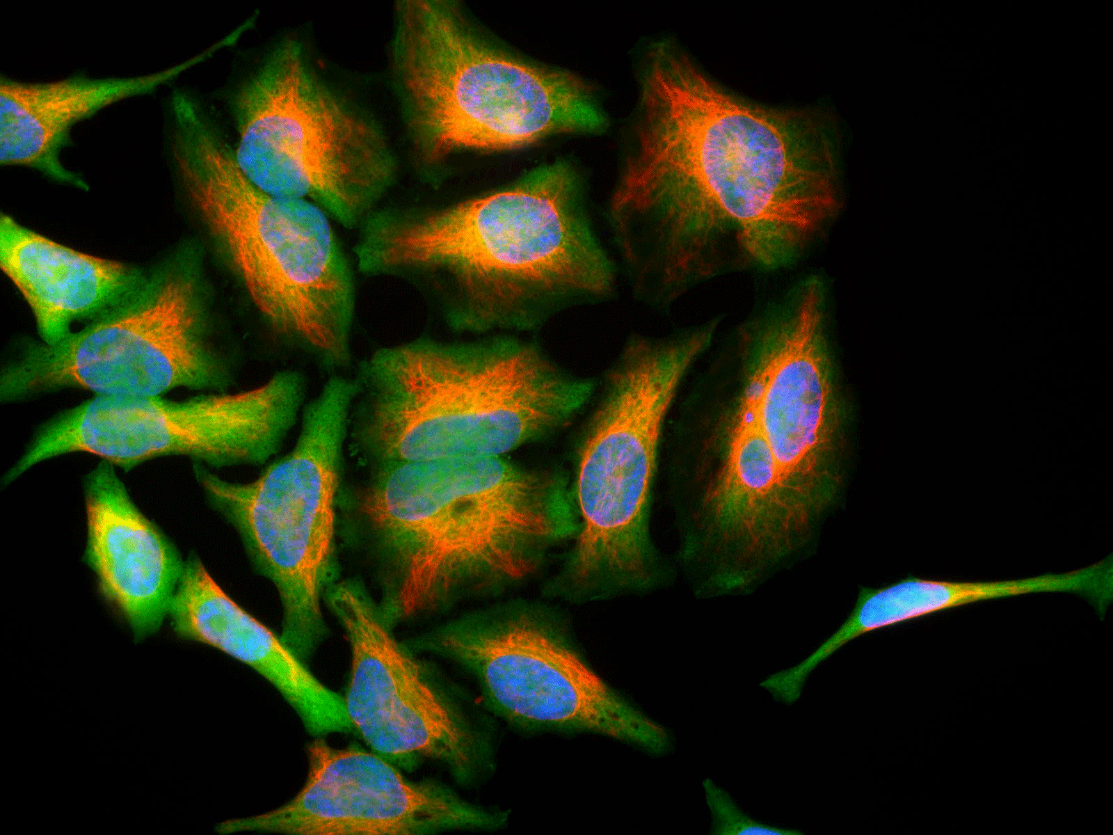 Immunofluorescence of HeLa cells stained with anti-park7 (green) showing strong cytoplasmic staining and anti-vimentin antibody (red), using Anti-Park7/DJ-1 monoclonal antibody.