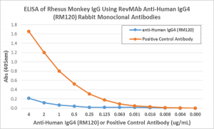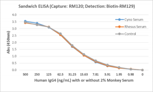 Detection of human IgG4 in monkey serum.Sandwich ELISA using RM120 as the capture antibody, and biotinylated anti-human light chains ( κ+ λ) antibody RM129 as the detection antibody, followed by a HRP conjugated streptavidin.