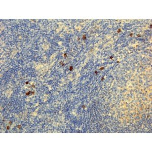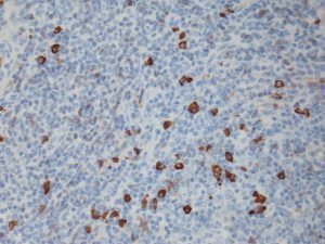 Immunohistochemical staining of formalin fixed and paraffin embedded human lymphoid tissue section using anti-human IgG4 rabbit monoclonal antibody (Clone RM120).