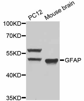 Western blot analysis of extracts of various cell lines, using GFAP antibody at 1:1000 dilution.Secondary antibody: HRP Goat Anti-Rabbit IgG (H+L) at 1:10000 dilution.Lysates/proteins: 25ug per lane.Blocking buffer: 3% nonfat dry milk in TBST.Detection: ECL Basic Kit.Exposure time: 90s.