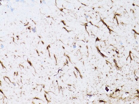 Immunohistochemistry of paraffin-embedded rat brain using GFAP antibody at dilution of 1:75 (40x lens).