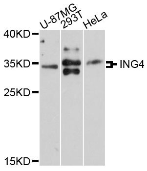 Western blot analysis of extracts of various cell lines, using ING4 antibody at 1:1000 dilution.Secondary antibody: HRP Goat Anti-Rabbit IgG (H+L) at 1:10000 dilution.Lysates/proteins: 25ug per lane.Blocking buffer: 3% nonfat dry milk in TBST.Detection: ECL Basic Kit.Exposure time: 90s.