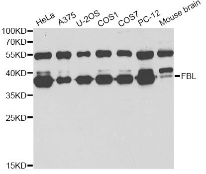 Western blot analysis of extracts of various cell lines, using FBL antibody at 1:1000 dilution.Secondary antibody: HRP Goat Anti-Rabbit IgG (H+L) at 1:10000 dilution.Lysates/proteins: 25ug per lane.Blocking buffer: 3% nonfat dry milk in TBST.