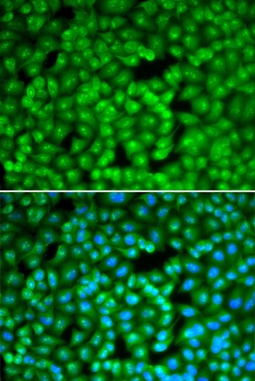 Immunofluorescence analysis of A549 cells using FBL antibody. Blue: DAPI for nuclear staining.