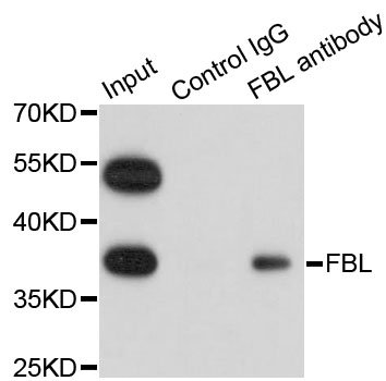 Immunoprecipitation analysis of 200ug extracts of HeLa cells using 1ug FBL antibody. Western blot was performed from the immunoprecipitate using FBL antibody at a dilition of 1:1000.