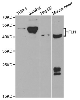 Western blot analysis of extracts of various cell lines, using FLI1 antibody at 1:1000 dilution.Secondary antibody: HRP Goat Anti-Rabbit IgG (H+L) at 1:10000 dilution.Lysates/proteins: 25ug per lane.Blocking buffer: 3% nonfat dry milk in TBST.Detection: ECL Basic Kit.Exposure time: 90s.