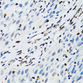 Immunohistochemistry of paraffin-embedded human uterine cancer using FLI1 antibody at dilution of 1:100 (40x lens).