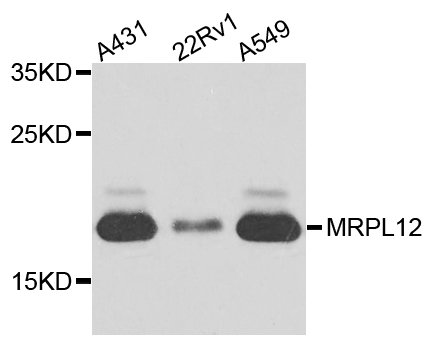 Western blot analysis of extracts of various cell lines, using MRPL12 antibody at 1:1000 dilution.Secondary antibody: HRP Goat Anti-Rabbit IgG (H+L) at 1:10000 dilution.Lysates/proteins: 25ug per lane.Blocking buffer: 3% nonfat dry milk in TBST.Detection: ECL Basic Kit.Exposure time: 15s.