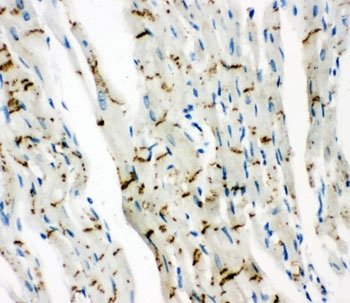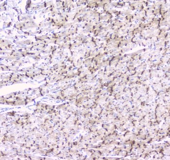 IHC testing of mouse heart tissue with Cx43 antibody at 1ug/ml. HIER: steam section in pH6 citrate buffer for 20 min and allow to cool prior to staining.