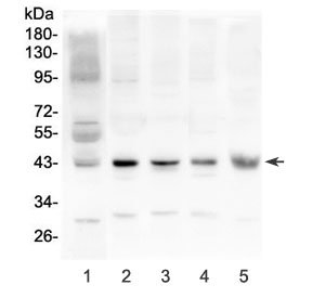 Western blot testing of 1) human placenta, 2) rat brain, 3) rat heart, 4) mouse brain and 5) mouse heart lysate with Cx43 antibody at 0.5ug/ml. Predicted molecular weight ~43 kDa.