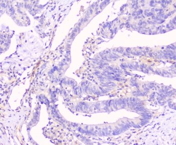 IHC testing of human intestinal cancer tissue with Cx43 antibody at 1ug/ml. HIER: steam section in pH6 citrate buffer for 20 min and allow to cool prior to staining.