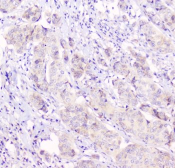 IHC testing of human breast cancer tissue with Cx43 antibody at 1ug/ml. HIER: steam section in pH6 citrate buffer for 20 min and allow to cool prior to staining.