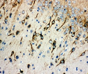 Western blot testing of AChR antibody and Lane 1: rat brain; 2: mouse brain; 3: U87; 4: SHG-44; 5: Neuro-2a; 6: HeLa cell lysateIHC-P: AChR antibody testing of rat brain tissue