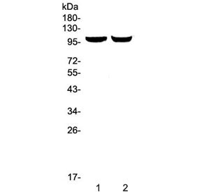 Western blot testing of 1) rat brain and 2) mouse brain lysate with Dynamin 2 antibody at 0.5ug/ml. Predicted molecular weight ~98 kDa.