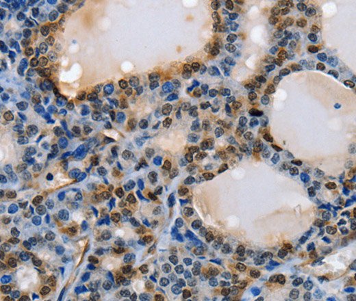 Immunohistochemistry of paraffin-embedded Human thyroid cancer using NFKBID Polyclonal Antibody at dilution of 1:40