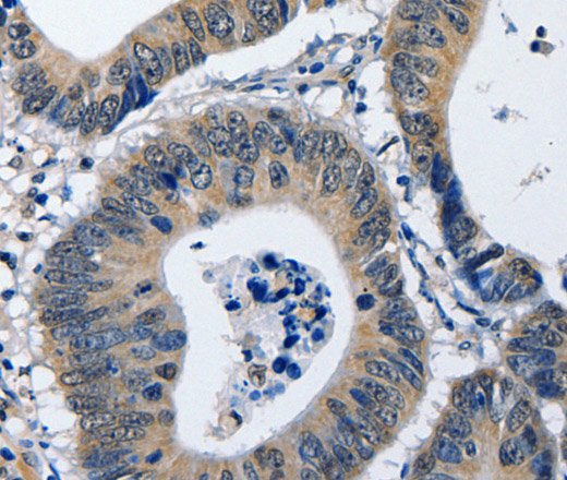 Immunohistochemistry of paraffin-embedded Human colon cancer using NFKBID Polyclonal Antibody at dilution of 1:40