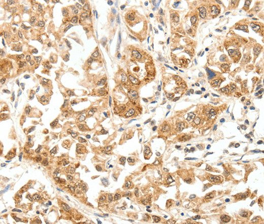 Immunohistochemistry of paraffin-embedded Human lung cancer using PAK5 Polyclonal Antibody at dilution of 1:10