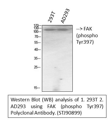 FAK is a protein encoded by the PTK2 gene which is approximately 119,2 kDa. FAK is localised to the cell membrane and cytoplasm. It is involved in ERK signalling, integrin pathway and EPH-ephrin signalling. It is a non-receptor protein-tyrosine kinase that plays an essential role in regulating cell migration, adhesion, spreading, reorganization of the actin cytoskeleton, formation and disassembly of focal adhesions and cell protrusions, cell cycle progression, cell proliferation and apoptosis. FAK is ubiquitously expressed with Isoform 1 and isoform 6 expressed in lung fibroblasts. Mutations in the PTK2 gene may result in malignant glioma. STJ93024 was affinity-purified from rabbit antiserum by affinity-chromatography using epitope-specific immunogen. This polyclonal antibody detects endogenous levels of FAK protein only when phosphorylated at Y397.This primary antibody specifically binds to endogenous FAK protein which only binds about Y397 when Y397 is phosphorylated.
