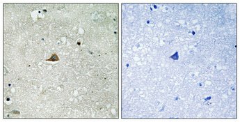 Immunohistochemical analysis of paraffin-embedded Human brain. Antibody was diluted at 1:100(4°,overnight). High-pressure and temperature Tris-EDTA,pH8.0 was used for anbitody retrieval. Negetive contrl (right) obtaned from antibody was pre-absorbed by immunogen peptide.