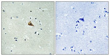 Immunohistochemical analysis of paraffin-embedded Human brain. Antibody was diluted at 1:100(4°,overnight). High-pressure and temperature Tris-EDTA,pH8.0 was used for anbitody retrieval. Negetive contrl (right) obtaned from antibody was pre-absorbed by immunogen peptide.