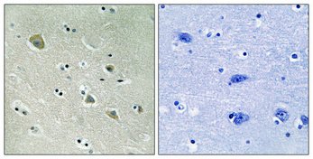 Immunohistochemical analysis of paraffin-embedded Human brain. Antibody was diluted at 1:100(4°,overnight). High-pressure and temperature Tris-EDTA,pH8.0 was used for anbitody retrieval. Negetive contrl (right) obtaned from antibody was pre-absorbed by immunogen peptide.