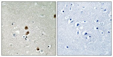 Immunohistochemical analysis of paraffin-embedded Human brain. Antibody was diluted at 1:100(4°,overnight). High-pressure and temperature Tris-EDTA,pH8.0 was used for anbitody retrieval. Negetive contrl (right) obtaned from antibody was pre-absorbed by immunogen peptide.