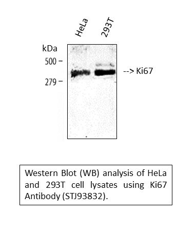 Ki67 is a protein encoded by the MKI67 gene which is approximately 358,6 kDa. Ki67 is localised to the nucleus. It is involved in DNA damage and neuroscience. It is a nuclear protein that is associated with and may be necessary for cellular proliferation. It is required to maintain individual mitotic chromosomes dispersed in the cytoplasm following nuclear envelope disassembly. It also associates with the surface of the mitotic chromosome, the peri-chromosomal layer, and covers a substantial fraction of the chromosome surface. Ki67 is expressed preferentially during late G1, S, G2 and M phases of the cell cycle. Mutations in the MKI67 gene may result in brain ependymoma and amyloplastic carcinoma. STJ93832 was affinity-purified from rabbit antiserum by affinity-chromatography using epitope-specific immunogen. This polyclonal antibody detects endogenous levels of Ki-67 protein.