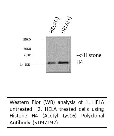 Histone H4 is a protein encoded by the HIST4H4 gene which is approximately 11,4 kDa. Histone H4 is localised to the nucleus. It is involved in pathways such as DNA double-strand break repair and the mitotic cell cycle. Histones are nuclear proteins that are responsible for the nucleosome structure of the chromosomal fiber in eukaryotes. There are four core histones (H2A, H2B, H3, and H4). Histone H4 is expressed in the liver, nervous system, eye, blood and intestine. Mutations in the HIST4H4 gene result in B-cell non-Hodgkin lymphoma. STJ97192 was affinity-purified from rabbit antiserum by affinity-chromatography using specific immunogen. This antibody detects the endogenous Histone H4 (Acetyl Lys16) protein.