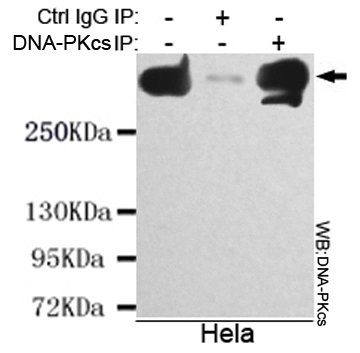 Immunoprecipitation analysis of Hela cell lysate using DNA-PKcs mouse mAb.
