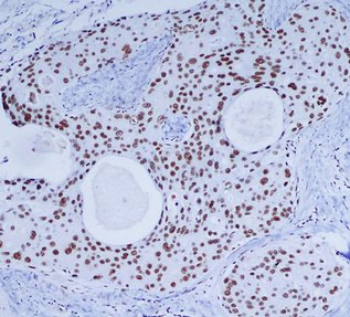 Immunohistochemical analysis of paraffin-embedded Breast cancer using DNA-PKcs mouse mAb (1:200 dilution).Antigen retrieval was performed by pressure cooking in citrate buffer (pH 6.0).