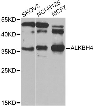 Western blot analysis of extracts of various cell lines, using ALKBH4 Antibody at 1:1000 dilution. Secondary antibody: HRP Goat Anti-Rabbit IgG (H+L) at 1:10000 dilution. Lysates/proteins: 25ug per lane. Blocking buffer: 3% nonfat dry milk in TBST. Detection: ECL Basic Kit. Exposure time: 10s.